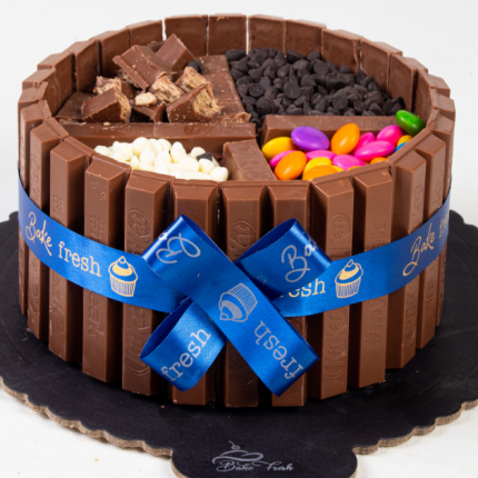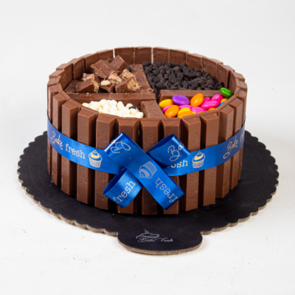 A cake that is surrounded by kit kat chocolates, having a milky chocolate flavour from the inside.